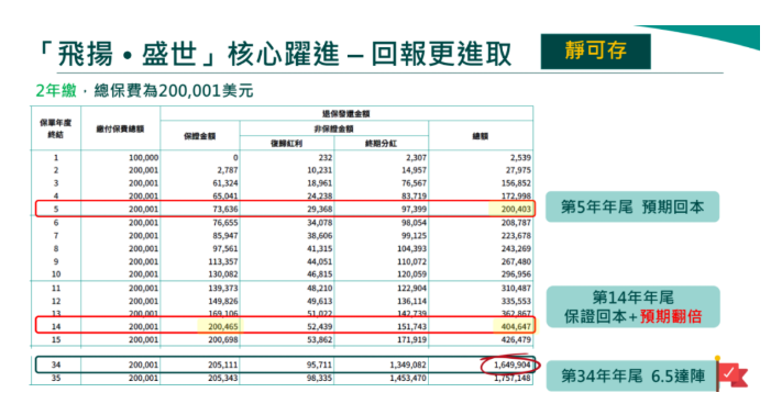 "飞扬·盛世"是一款2年缴费的美元储蓄寿险,主打"短期投入、长期回报",