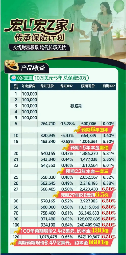 「宏挚家传承」精准锚定长期财富目标,以时间换空间,追求稳健且具备爆发力的倍数增长。以总保费50万美元(分5年缴清)的保单为例:
