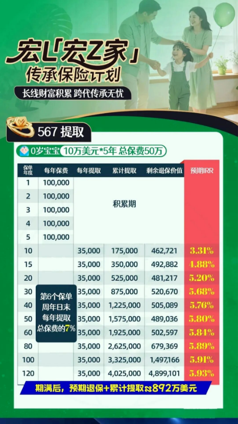 以0岁宝宝投保、年缴10万美元分5年缴清的保单为例,按567提取方案执行,自第6个保单年度起每年提取总保费的7%(即3.5万美元)。