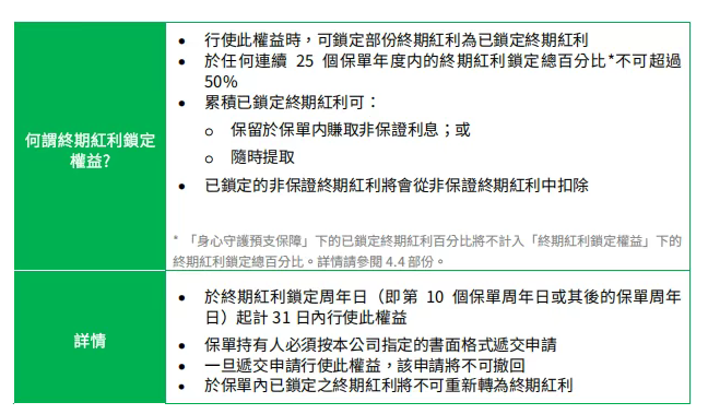 自第10个保单周年日起,可申请行使「终期红利锁定权益」,25年内累计锁定比例不超过50%。